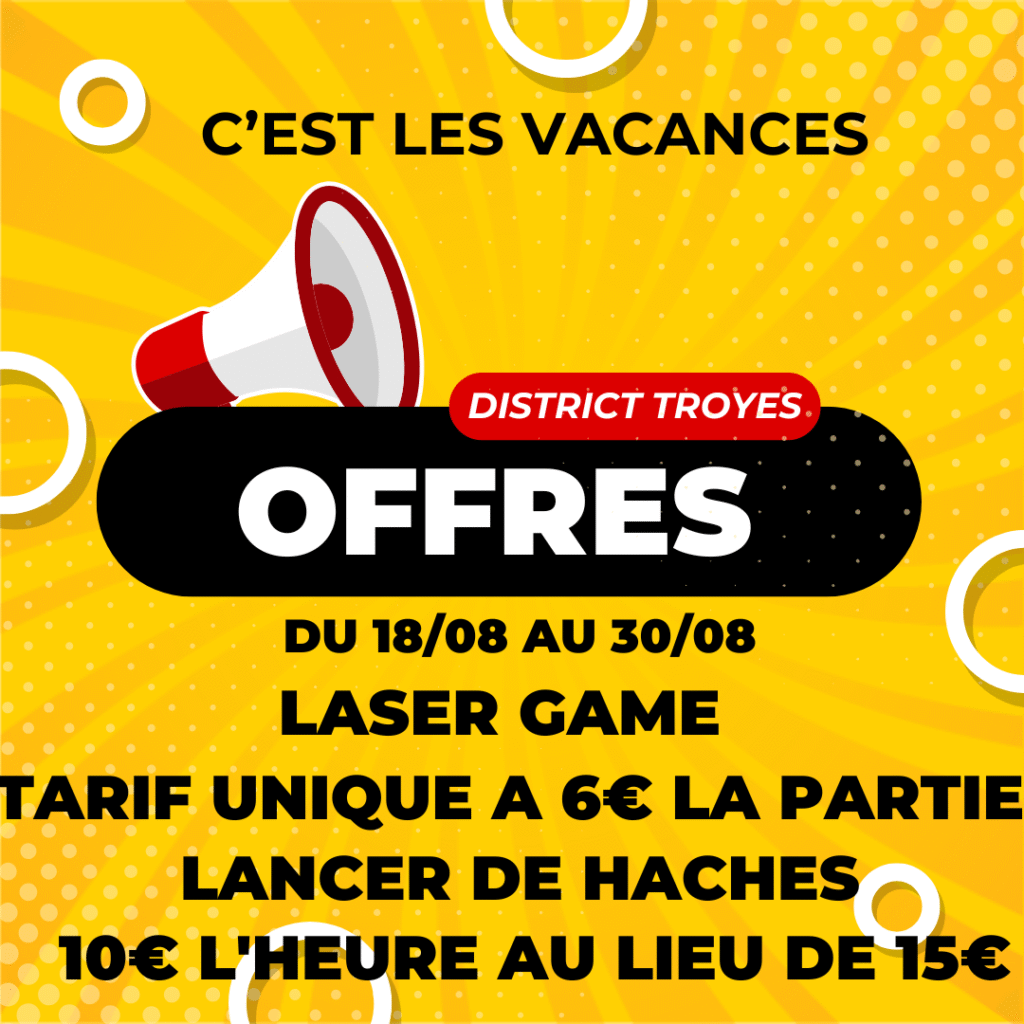 Découvrez le District, votre complexe de loisirs dans l’Aube pour toute la famille ! Laser game, lancer de haches ou shurikens, shotball ou encore box karaoké sont disponibles pour passer un moment atypique sur Troyes. Notre établissement dispose d’un bar licence IV et d’un service de restauration.